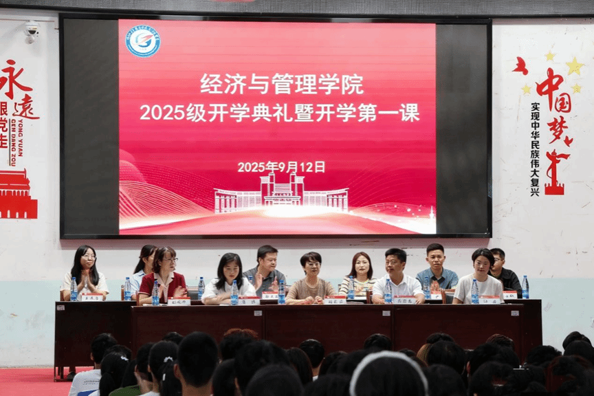 1214:30,经法楼报告厅国歌嘹亮,开学典礼正式启幕。院长黄宏磊以“胸怀鸿鹄之志,勇当经世之才”为题,为新生解读学院“重实践、强应用”育人底色;教师代表吕阳博士发出“扎根求知、向上生长、同行共进”三问;2023级马燕学姐分享“学科竞赛+志愿服务+实习实践”立体成长路径;新生代表姜懿桐喊出“青春有力、有底、有魂”的00后宣言。党委书记刘莉萍最后抛出“做会思考、敢尝试、有温度的经管人”的殷切期望,掌声经久不息。