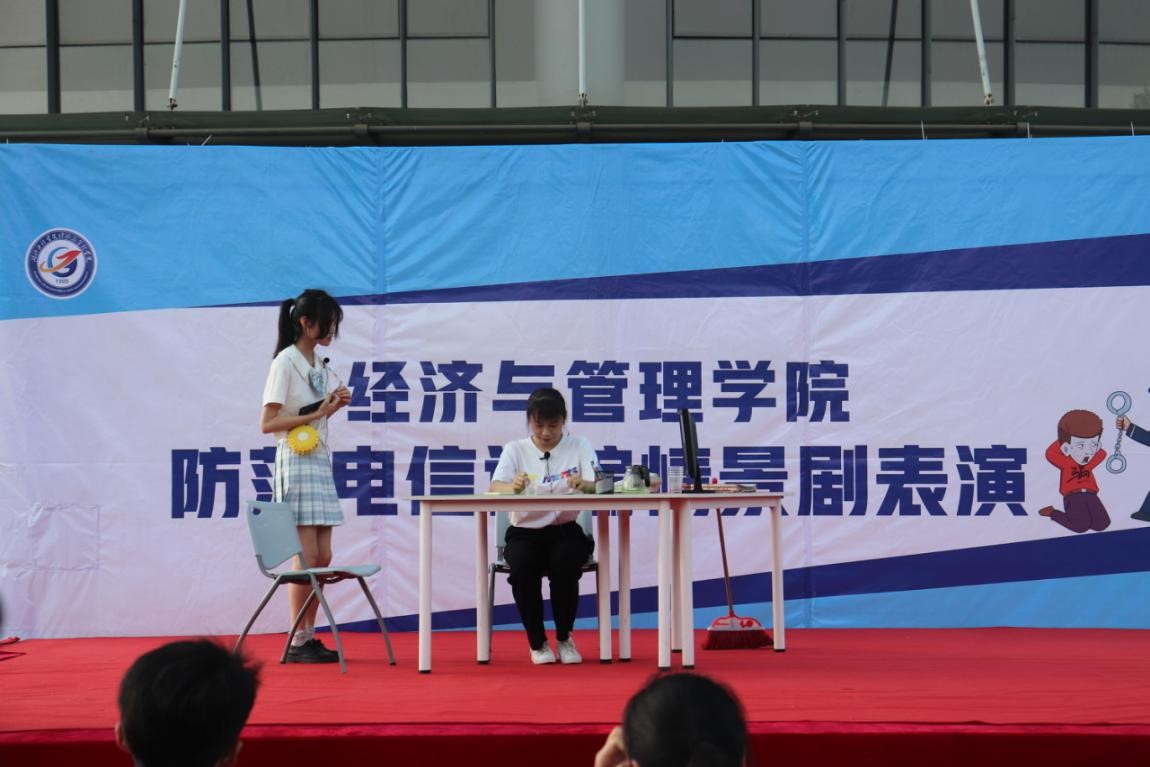 随着一曲防电诈版本的《卡路里》演唱,活动现场的气氛瞬间点燃,热烈的现场氛围吸引了学校近千名学生驻足观看。随后的情景剧以女大学生被骗5000元为开端,演绎了被骗过程、求助方式以及如何提高安全防范意识等内容。而在情景剧中穿插的学生分享、防电诈小知识问答等互动环节,更为有趣的向学生们传达了防诈骗知识。