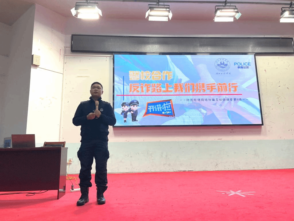 为了进一步增强同学们防范电信网络诈骗的意识,预防和减少电信网络诈骗案件的发生,10月20日,我院在经法楼报告厅举行了以“防范电信诈骗”为专题教育的宣讲活动。出席本次活动的嘉宾和领导有孝感市公安局孝南区分局政工室副主任刘文波主任、校学工部熊伟老师、院党总支副书记姜涛老师、院分团委书记彭澎老师、辅导员吴俊成老师、黄卓航老师。
