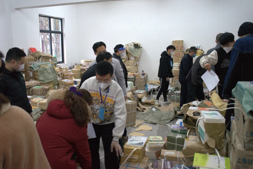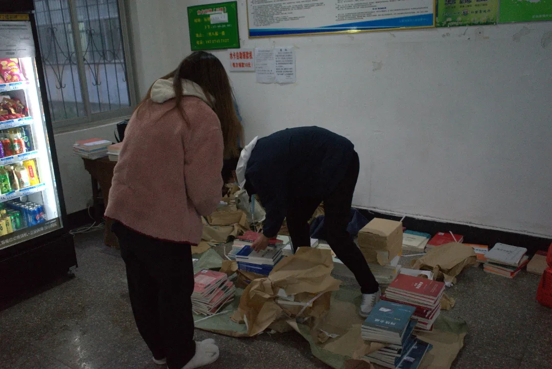 志愿者们在宿舍内正将分装好的一人份图书发给同学们。
