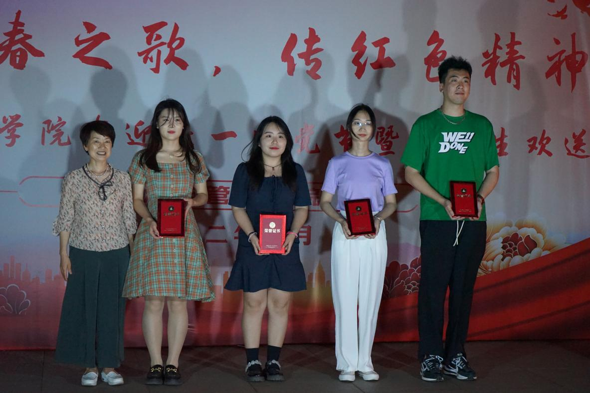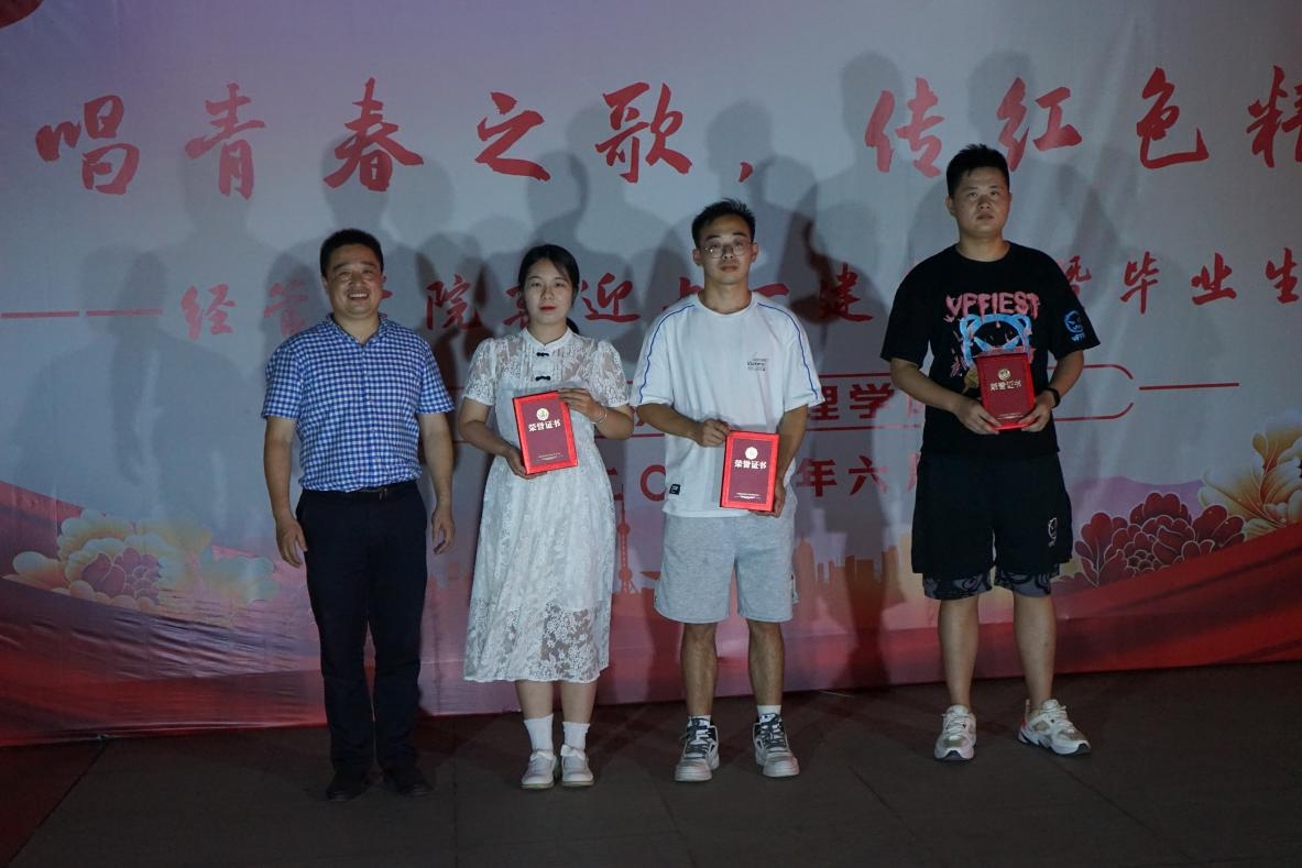 联唱过后,由经管学院党总支书记刘莉萍老师、院长张辉老师为陈睿、付佳、阮洁、温文雅、谭畅、陈冰玉、万义志、柯阳明等优秀毕业生颁奖,并与他们合影留念。最后,经管学院师生同台演唱歌曲《没有共产党就没有新中国》,为本次活动拉下帷幕。