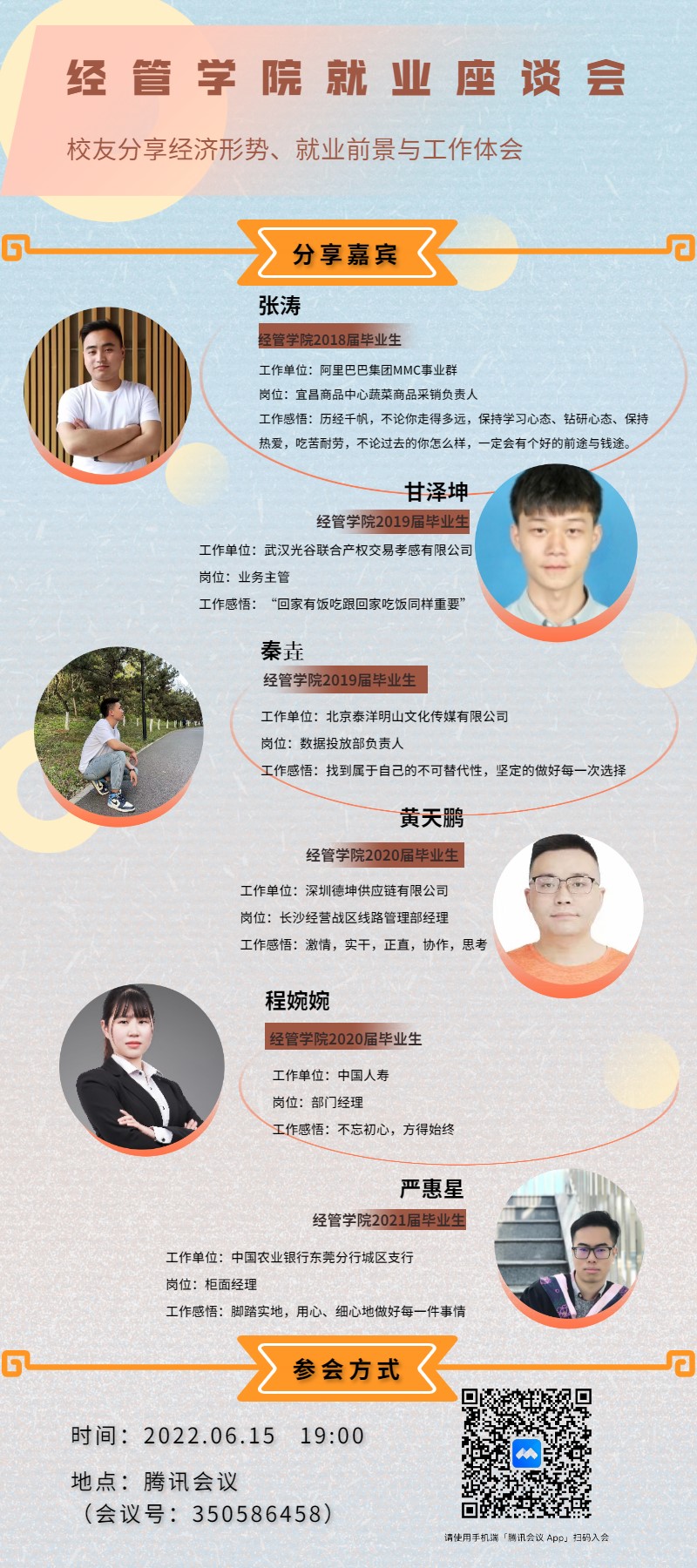 6月15日晚7点,经管学院举办线上就业座谈会,本次活动邀请了张涛、秦垚、甘泽坤、黄天鹏、严惠星等5名经管学院的优秀校友与大家分享他们眼中的就业形势、前景和毕业几年来的工作体会,为在校大学生们答疑解惑。