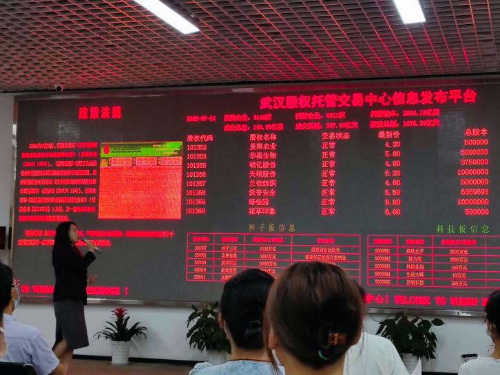 武交中心专业讲解员汪洋为师生们介绍了武交中心的概况。师生们了解到,武汉股权托管交易中心是湖北省唯一一家合法的区域性股权市场(即四板市场)运营机构,其定位是企业形象展示厅、企业融资蓄水池、企业上市预科班、企业发展助推器,是湖北省人民政府扶持中小微企业政策措施的综合运用平台,其主要功能是为中小微企业等市场主体提供规范内部治理、股权托管交易、股权投资融资、企业并购重组、转板上市培育等综合金融服务。目前该中心已托管企业近7000家,托管总股本逾2000亿股,挂牌企业6142多家,实现融资总额逾1675.69亿元,主要业务指标居于全国同业机构前列。当前该中心挂牌企业实行分板管理,目前有股份板、科技板、青创板、海创板、种子板等板块,不同板块企业的来源不同,资质上也有所差别。