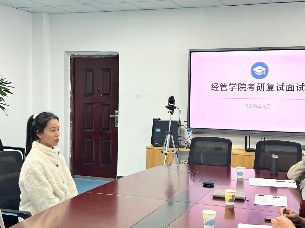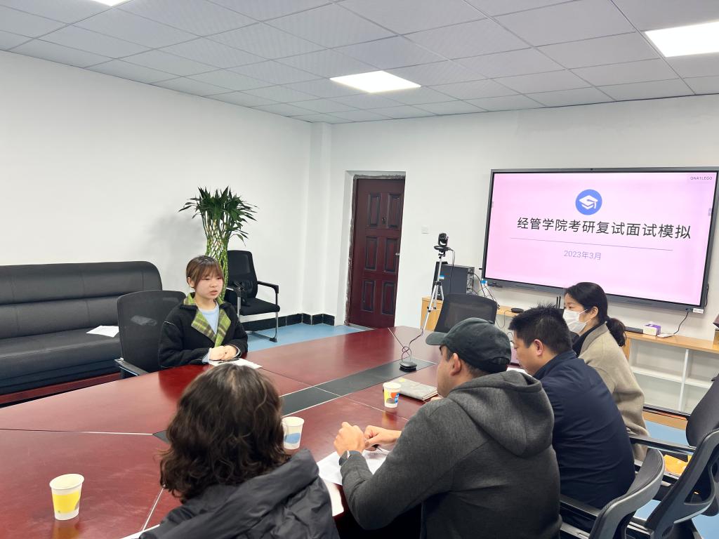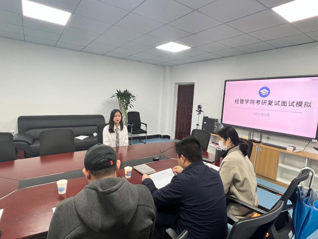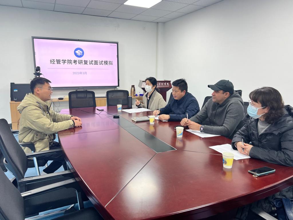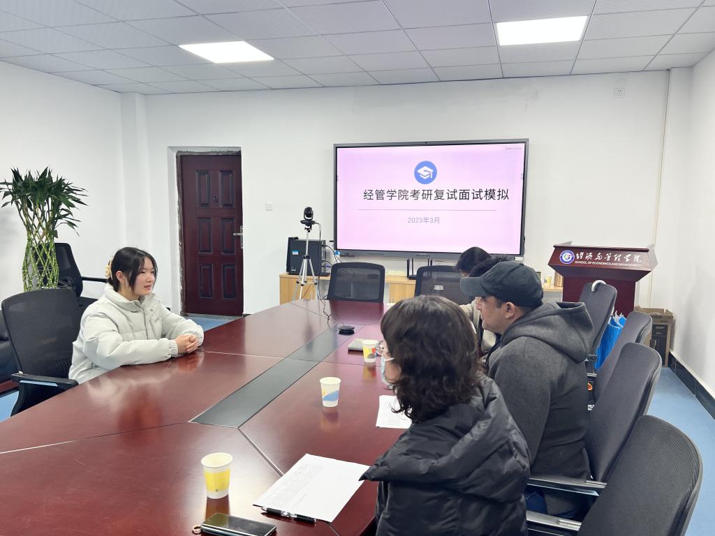 为进一步帮助2023届考研过线学生掌握复习方法和了解备考重点,熟悉研究生面试流程和相关要求,缓解心理压力和焦虑情绪,提升应考能力和面试技巧。3月22日下午,经管学院在经法楼401举办了2023届考研过线学生复试模拟面试,本次模拟面试由经管学院副院长黄宏磊博士、金融工程系主任刘姣华博士、经济学系主任郭丹博士和Sam博士担任面试官,共有6位考生参与了此次面试。