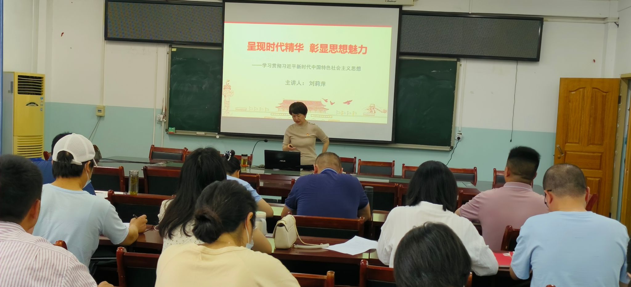 刘莉萍书记以《呈现时代精华 彰显思想魅力——学习贯彻习近平新时代中国特色社会主义思想》为题,首先给党员同志简要介绍了学习贯彻习近平新时代中国特色社会主义思想的必要性、工作安排和学习主要书目。接着详细阐述了如何理解深刻把握习近平新时代中国特色社会主义思想的时代性、实践性、系统性、科学性、人民性。最后提出学习贯彻习近平新时代中国特色社会主义思想要在学深悟透、融会贯通的基础上,发扬理论联系实际的马克思主义学风,做到知行合一、学以致用。