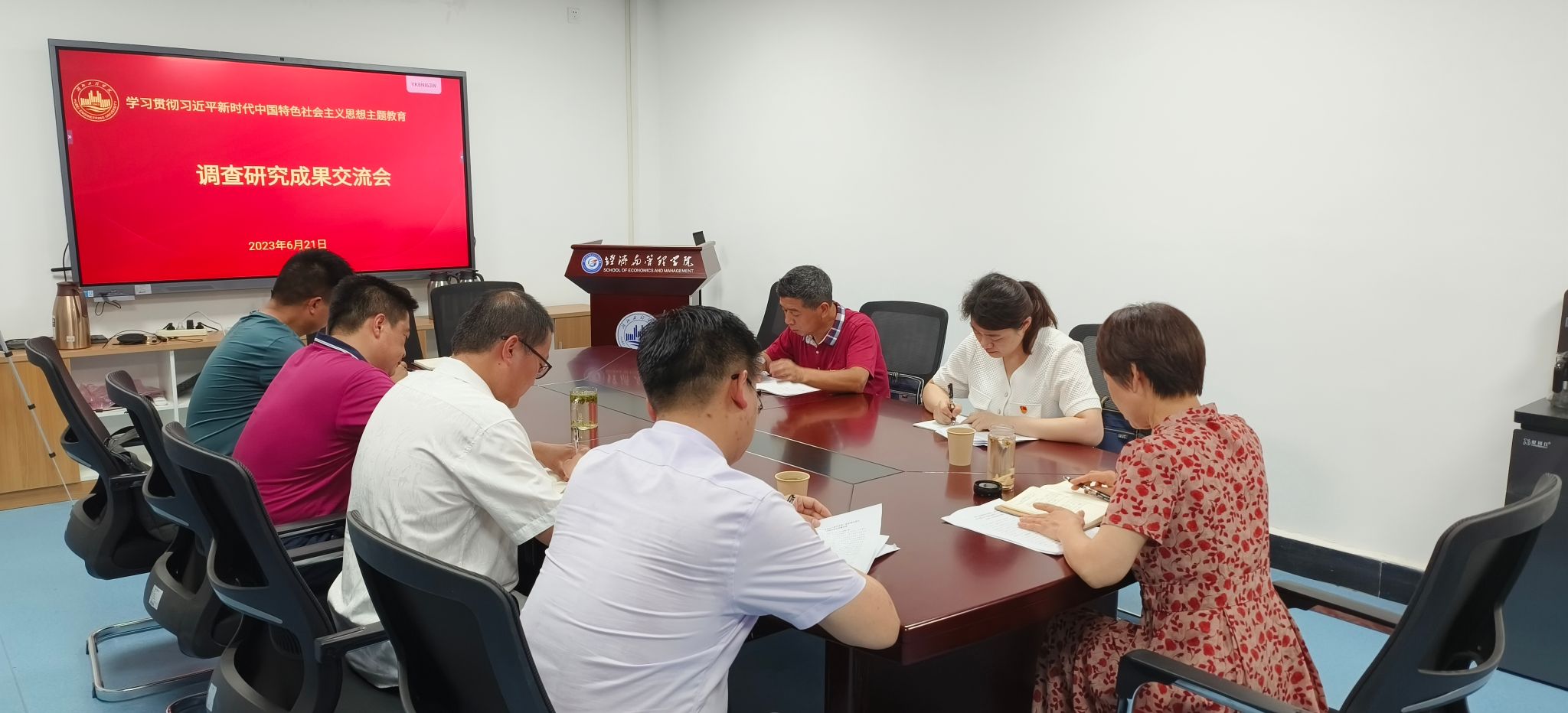 领导班子成员依次做调查研究成果交流。刘莉萍书记聚焦党建与事业发展融合,解析了如何以高质量党建引领学院事业高质量发展。张辉院长以孝感市主城崛起和我院的专业建设为主题,提出了孝感市主城崛起的实施路径和经济管理类专业的发展思路。黄宏磊副院长汇报了《基于高质量充分就业的大学生应用能力培养路径研究》,张承龙副院长阐述了《以习近平总书记“绿色发展”理念推动我市家庭农场高质量发展》,胡涵副书记围绕毕业生就业工作,分析了我院毕业生的就业需求和质量状况。