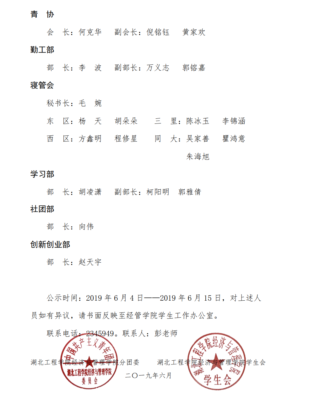 为促进学生工作有序开展,更好地发挥学生组织服务学院、服务师生的积极作用,经过初期学生自荐、竞选答辩、组织考察等环节,学生会各部门负责人认真讨论、仔细研究并交由换届工作领导小组审核,现将williamhill英国 2019 届学生会见习主席团、部长名单公示如下: