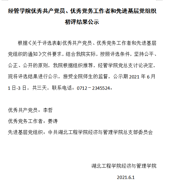 经管学院优秀共产党员、优秀党务工作者和先进基层党组织初评结果公示