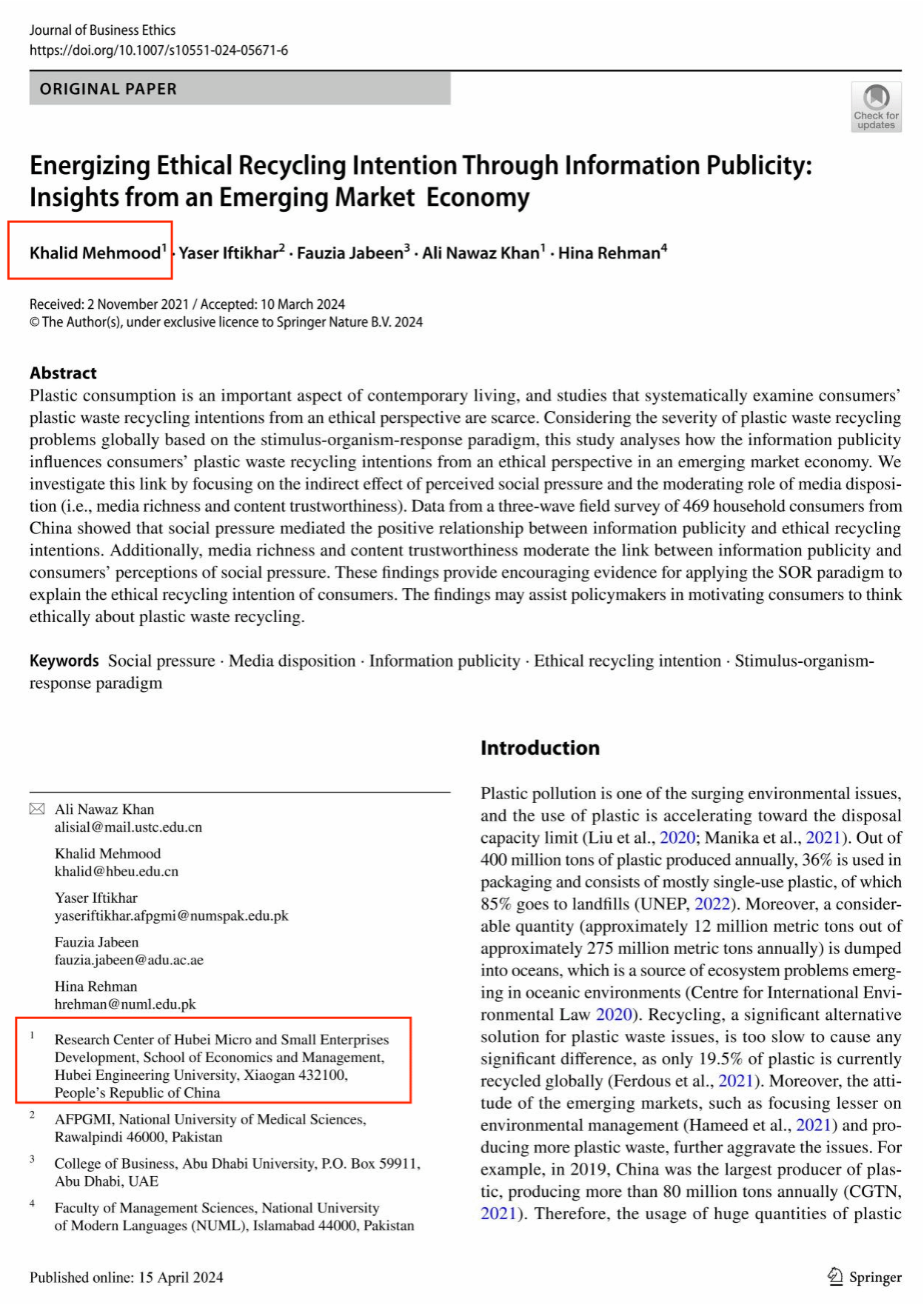 近日,我院教师Khalid Mehmood博士取得重要学术成果,他的一篇题为“Energizing Ethical Recycling Intention Through Information Publicity: Insights from an Emerging Market Economy”(通过信息宣传来激发合乎道德的回收意愿:来自新兴市场经济的观点)的论文在著名的期刊《Journal of Business Ethics (JBE)》上在线发表。