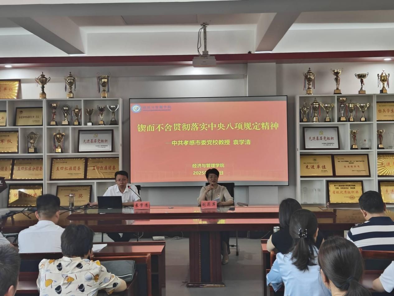 为夯实全面从严治党根基,推动作风建设走深走实,6月5日,经管学院联合化材学院举办“锲而不舍贯彻落实中央八项规定精神”学习教育专题党建活动。活动特邀中共孝感市委党校袁学清教授作报告,两院全体教师党员及经管学院学生党员共同参与学习。