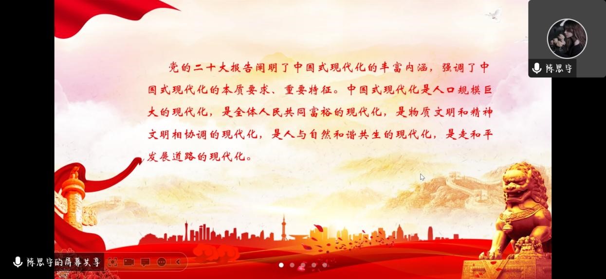 各班级对中国式现代化的重要特征、本质要求和重大原则进行了深入学习和交流,进一步加强了对中国式现代化的认识。中国式现代化是人口规模巨大的现代化,是全体人民共同富裕的现代化,是物质文明和精神文明相协调的现代化,是人与自然和谐共生的现代化,是走和平发展道路的现代化。