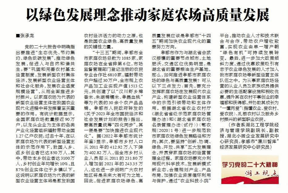 他强调,党的二十大报告中明确指出要推进“生态优先、节约集约、绿色低碳发展”,孝感市作为与湖北省会武汉接壤的重要节点城市,是湖北省的重要粮油生产基地,如何推进孝感市家庭农场的绿色与高质量发展?他认为:一是要充分发挥家庭农场在发展现代农业产业、构建新型农业经营体系中的示范引领带动和主体作用;二是要坚持“创新、协调、绿色、开放、共享”新发展理念,并贯穿家庭农场的经营管理全过程;三是要进一步加大政策倾斜力度,通过优惠政策吸引有志于农业绿色发展的人才加入我市家庭农场等新型经营主体队伍之中。