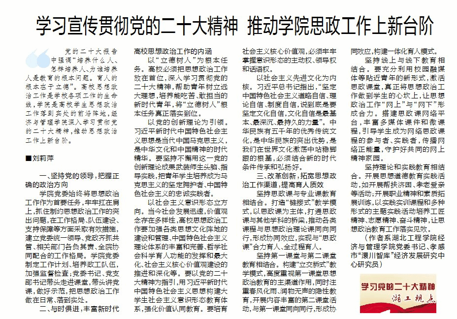 孝感日报从2023年3月22日起,开设“学习贯彻党的二十大精神·湖工视点”专栏,连续刊载了我校教师学习宣传贯彻党的二十大精神系列学习成果,掀起我校师生学习宣传贯彻党的二十大精神新高潮。