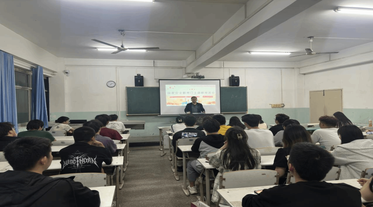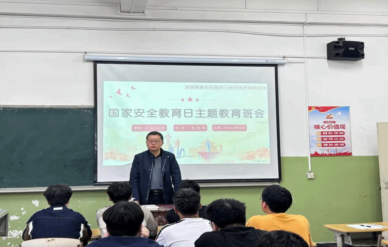 图为学院组织员王锋教授在22级141班参加国家安全教育日主题班会活动。