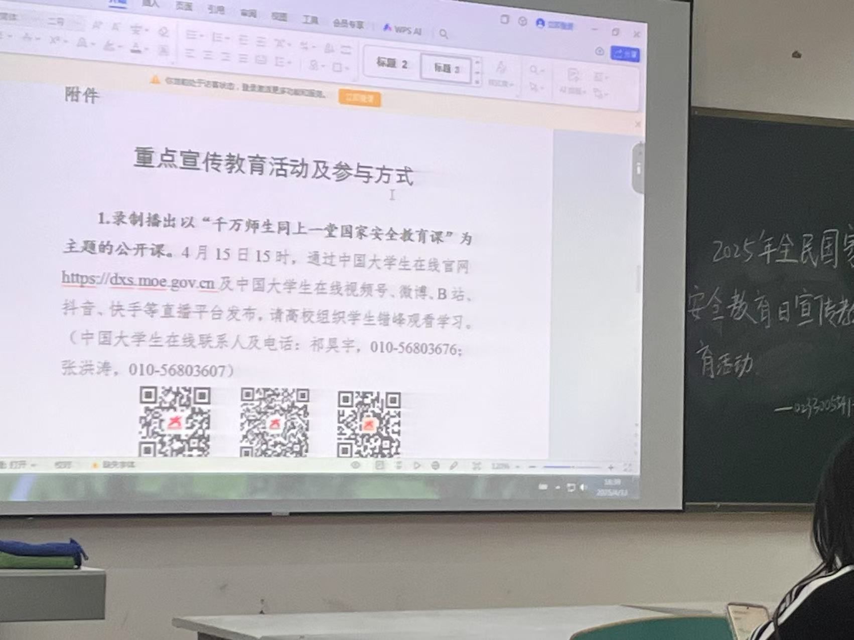 四是以观看安全教育公开课,进一步夯实维护国家安全。组织无课的班级通过中国大学生在线官网、中国大学生在线视频号等直播平台,采取多种形式观看以“千万师生同上一堂国家安全教育课”为主题的公开课。认真聆听中国南海研究院王胜教授、山东大学马克思主义学院(威海)郝书翠教授、北京邮电大学网络空间安全学院付俊松副教授联合讲授的安全教育课,深刻领悟到国家安全的重要性,进一步凝聚起国家安全共识。