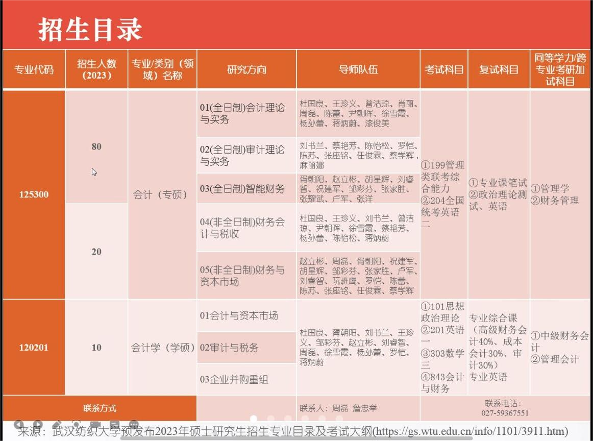 祝教授首先介绍了武汉纺织大学的历史沿革和基本情况;其次从学科特色、师资团队、科研成果介绍了会计学院;接下来重点介绍了学院硕士点,主要从MPAcc项目、会计学硕士、奖助学金、招生目录、报录情况等展开说明,重点突出专硕与学硕的区别、完善的奖助贷体系,帮助大家更深入的了解研究生学习及招考情况;最后介绍了未来就业去向,主要是攻读博士、公务员、知名事务所、企事业单位,并鼓励大家积极报考会计学院研究生。
