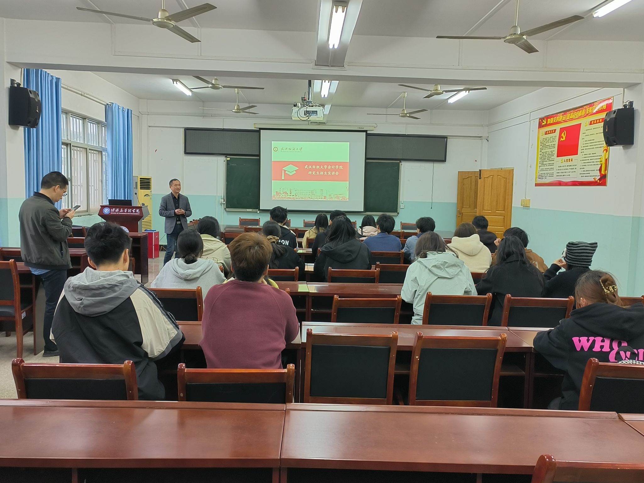 为帮助大三学生拓展视野,了解学术研究动态,明确专业考研方向,树立考研信心,2023年3月16日下午14:30,我院在经法楼403举办了武汉纺织大学会计学院研究生招生宣讲会。此次讲座特邀武汉纺织大学副教授,硕士生导师、博士蔡学辉主讲,宣讲会由学院副书记胡涵主持,2020级相关专业学生参加宣讲会。