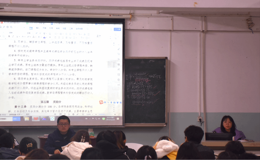 最后, 王春茹老师为大家详细讲解了经管学院综合测评细则,让同学们对综合测评方案有了较为系统的认识和了解。她强调了综合测评成绩是学生评奖评优的重要依据,鼓励学生要充分进行自我管理、自我服务、自我教育、自我监督,争先创优、发展特长,努力成为德、智、体、美、劳全面发展的高素质创造性人才。