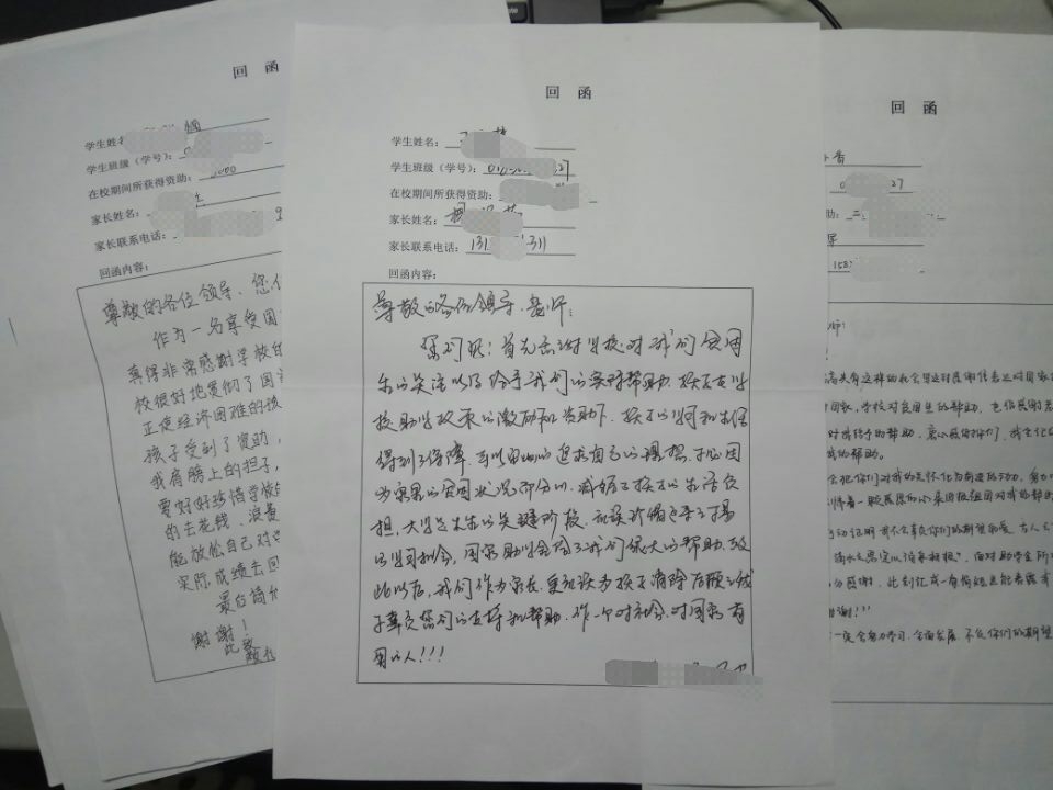 2019年1月,我院利用寒假学生回家之际,给2018年获得国家奖、助学金的每位学生家长送达喜报,给获得助学金的学生家长送达一封信,目的是使学生家长了解自己孩子在校的学习情况、资助情况以及国家、学校的有关资助政策,监督孩子合理正确的用好奖助学金,并以实际行动回馈国家和学校。