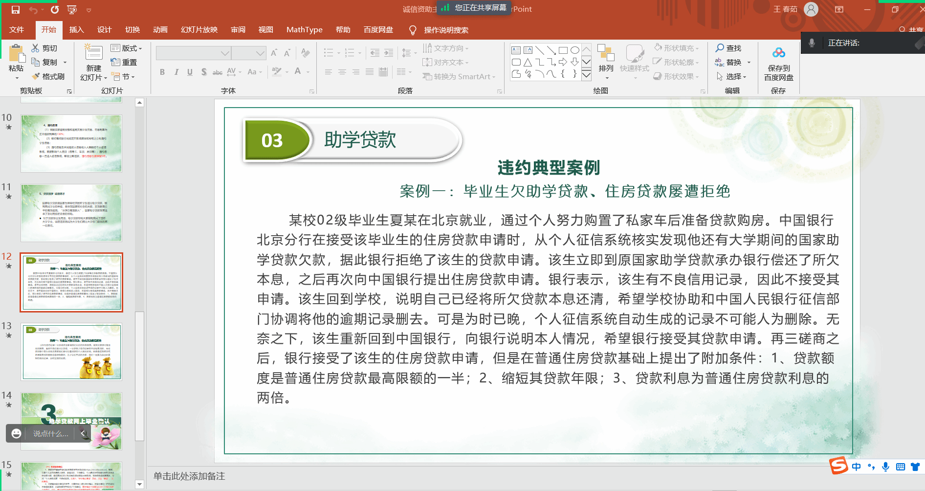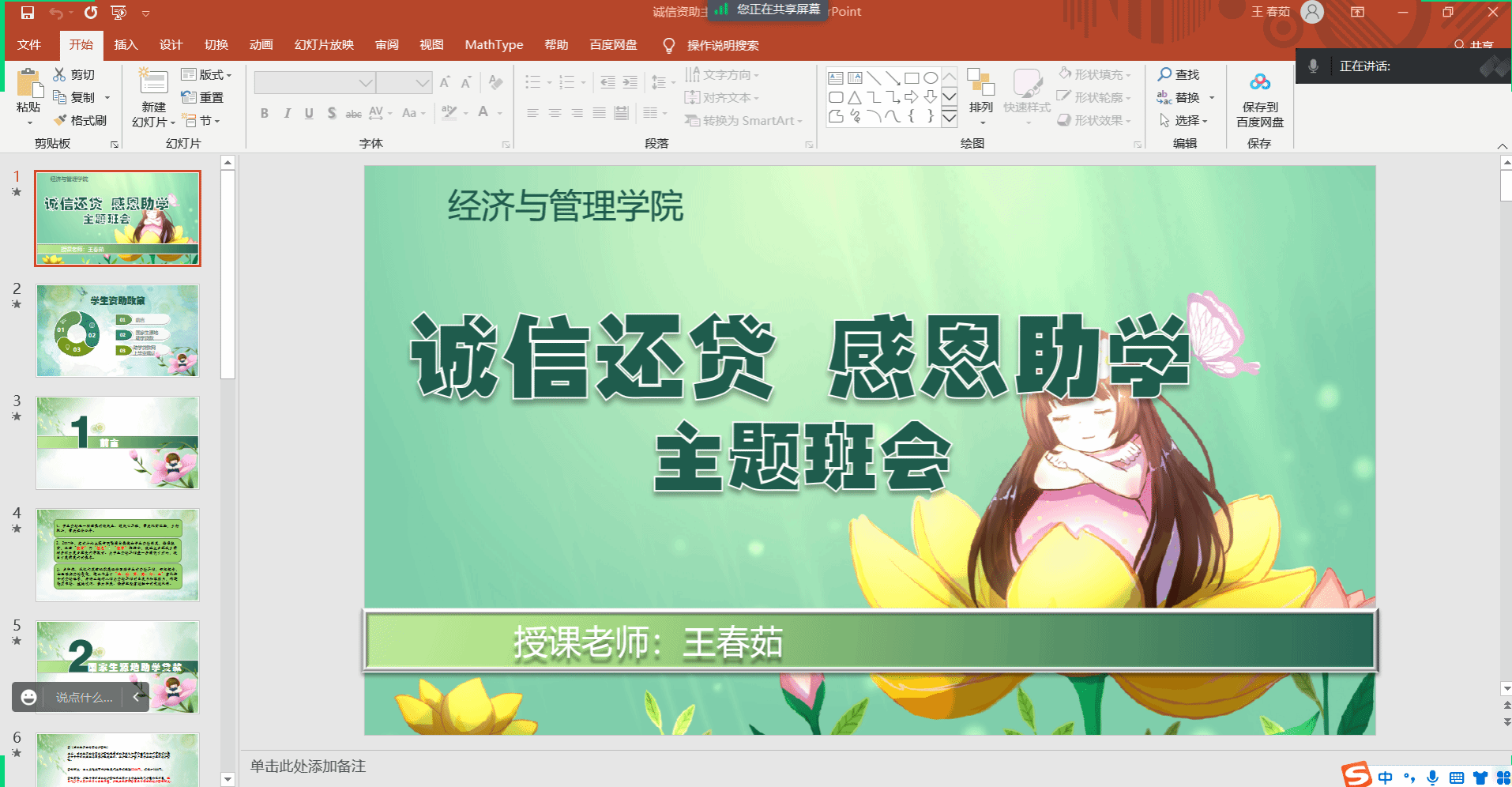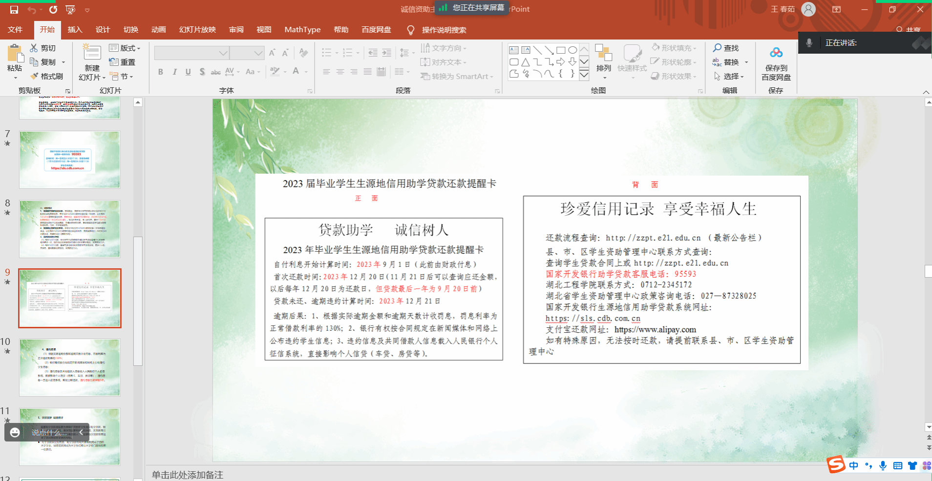 此次主题班会首先向学生宣传了国家助学贷款及其资助政策,告知学生国家助学贷款的具体还款流程,以及贷款合同务必妥善保管的必要性。毕业生需要完成“国家开发银行生源地贷款管理系统”中信息确认,并按时提交纸质确认表。此外,列举部分不能按时履行国家助学贷款合同的学生案例并分析其中利害关系,告知学生建立诚信档案的必要性,督促学生加强诚信观念,提高诚信意识和法律意识。