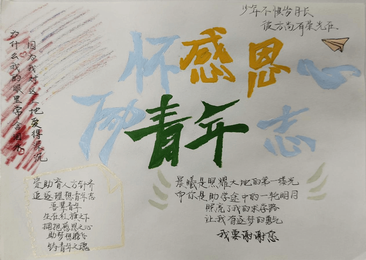 作品主要是以简约手操报的形式呈现,采用艺术字“怀感恩心,励青年志”为大标题点明主题。作品左上角引用艾青先生《我爱这土地》中的诗句来表达吾辈青年的爱国浓情。右上角的“少年不惧岁月长,彼方尚有荣光在”表现了吾辈青年敢想敢做的人生态度。作品下方为两段作者组编的短诗,点明国家为全面落实教育方针,大力推动资助育人工作,鼓励受资助的学生奋发自强,胸怀感恩之情。