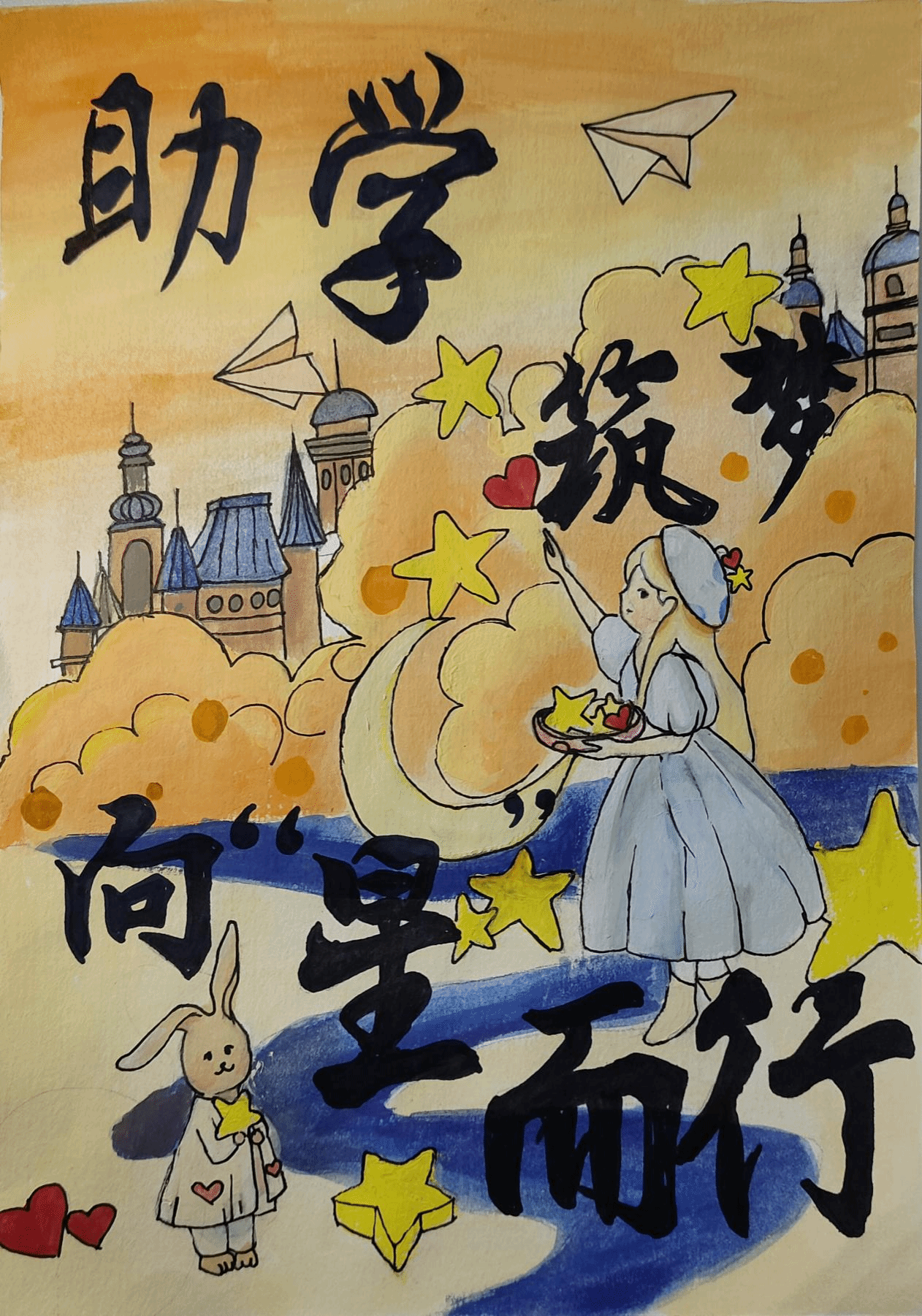 资助就会像点点星光,点缀广阔的天空,而我们,也将怀揣梦想,向星光指引的方向不断前进。通过这个作品激励被资助学生,学会感恩,努力学习,成为国家栋梁之才。