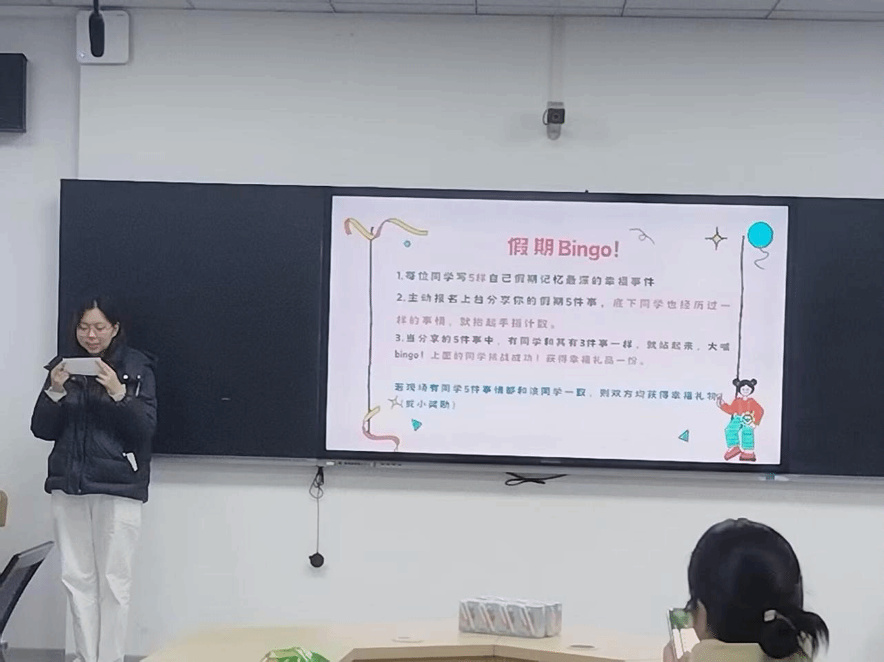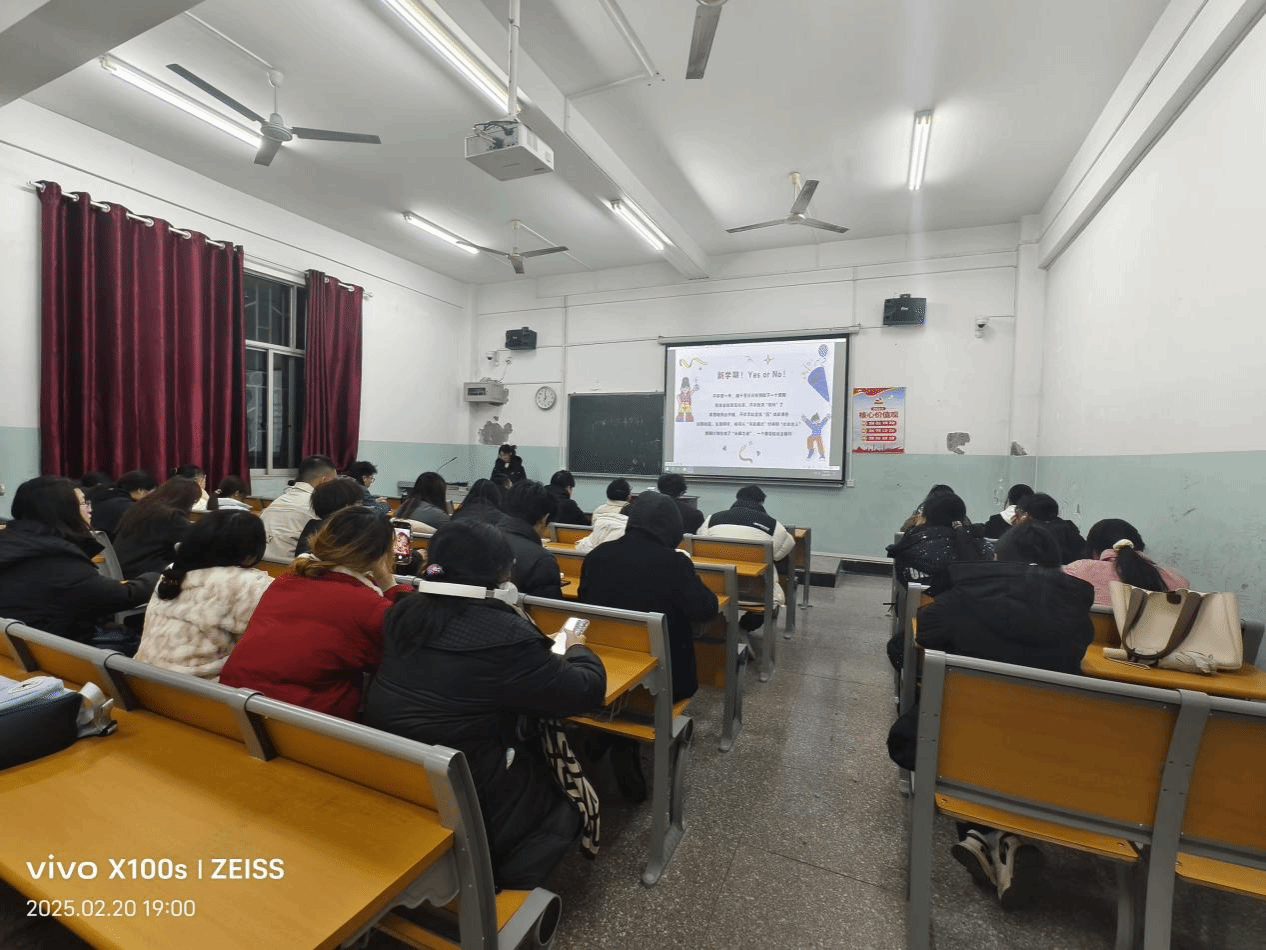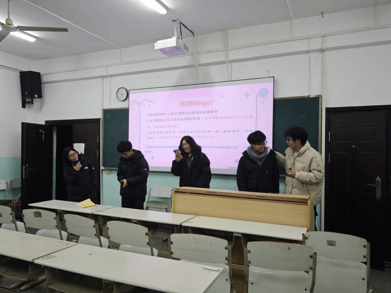 班会以“新学期Yes or No”趣味问答开启破冰之旅。在“假期BINGO”互动环节,学生通过书写寒假幸福事件、匹配他人经历,在“五件事重合即BINGO”的规则下,触发集体情感共鸣。在“幸福类型探索”环节,班主任结合神经科学理论,以多媒体课件生动解析多巴胺、内啡肽、催产素、血清素四大神经递质的作用机制。通过“多巴胺如烟花般绚烂短暂”“内啡肽似汗水凝结的勋章”等生活化比喻,引导学生建立科学幸福观。2023级经济学专业张同学分享感悟:“现在能理解为什么追剧的快乐和运动后的成就感不同了,原来幸福也有不同的‘化学配方’。”