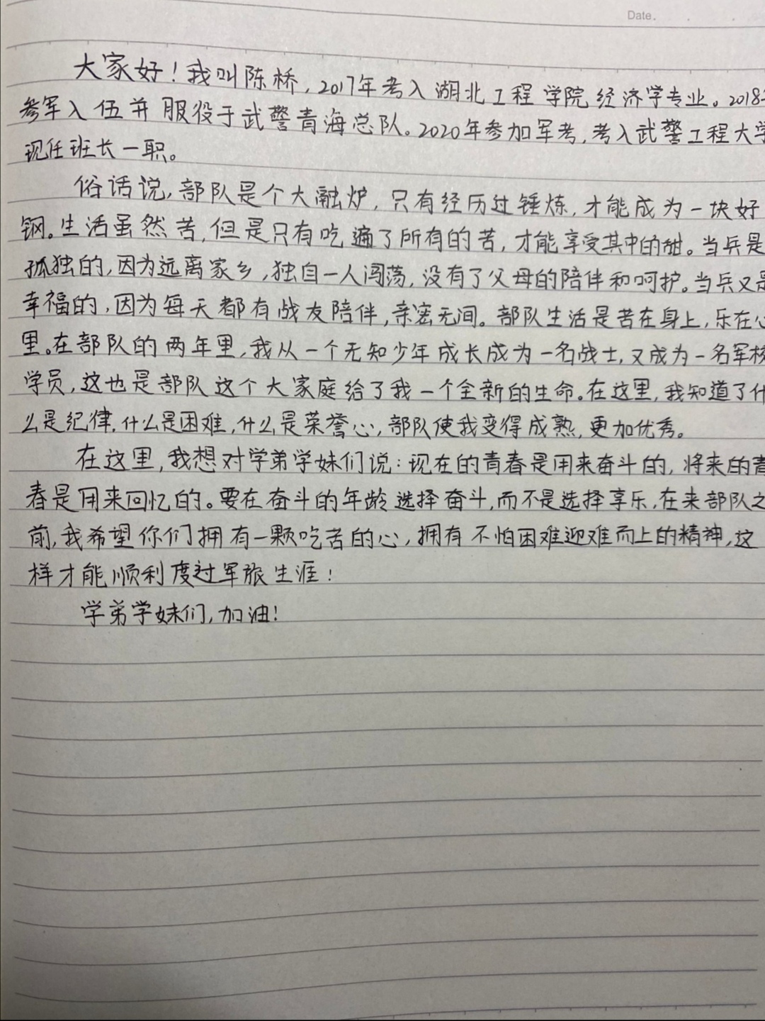 大家好,我叫陈桥,2017年考入williamhill英国中文经济学专业,2018年参军入伍并服役于武警青海总队。2020年参加军考,考入武警工程大学,现任班长一职。