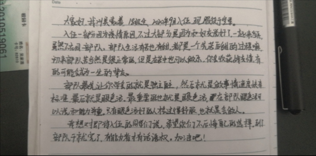 我想对即将入伍的同学说,希望你们不后悔自己的选择,到了部队干就完了,有能力者才有话语权,加油吧!