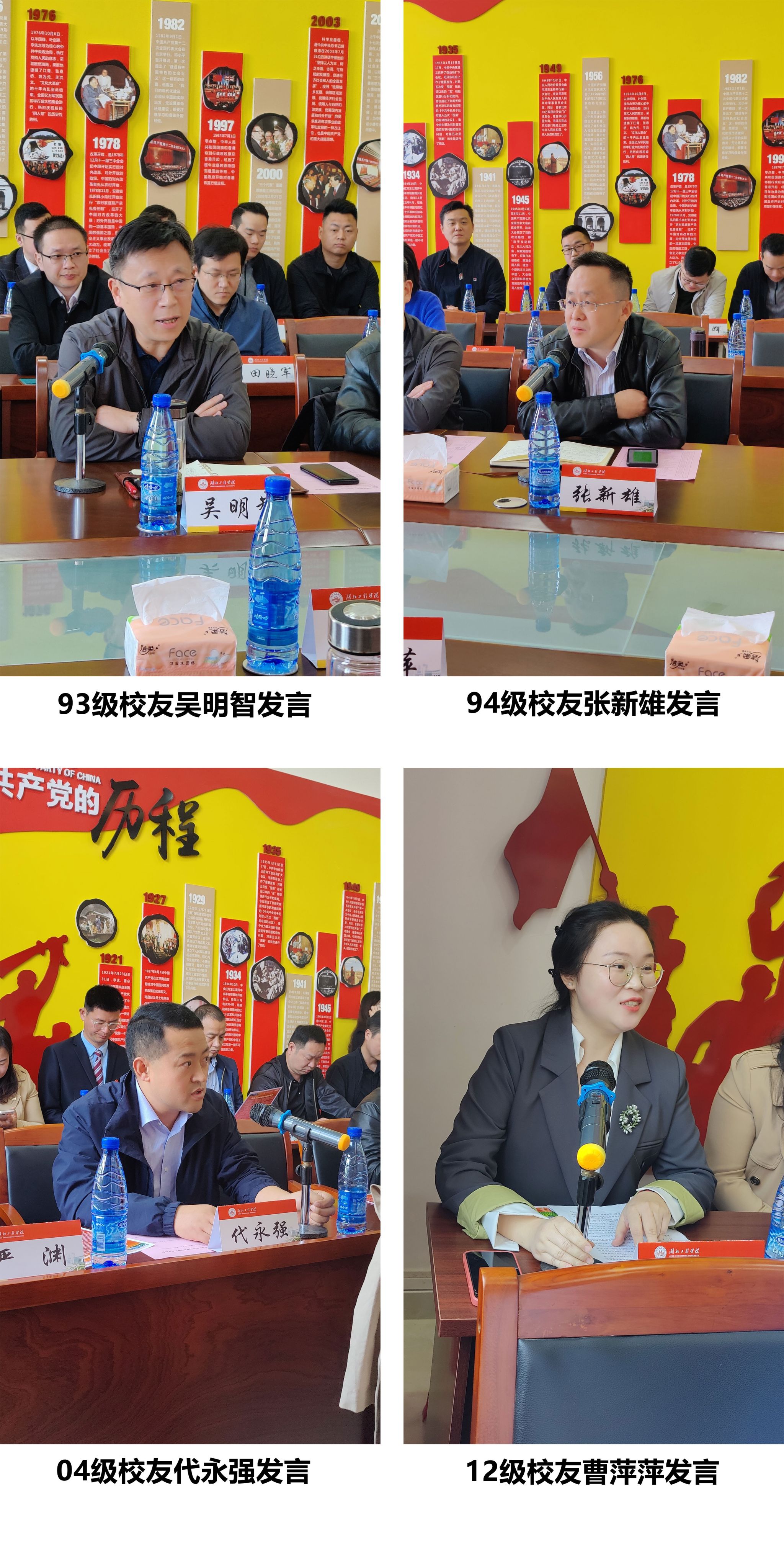 4名不同届别的校友代表积极发言,介绍了个人职业发展情况,表达了对母校的感恩之情,对学院学科专业建设方面提出了宝贵意见。93级校友吴明智针对学院办学方向、校地合作、校企合作等方面提出了很好的建议,希望学院与孝昌县的电商孵化平台、832平台、工商企业开展专业培训、实习实训、就业等方面的深度合作,实现双赢。94级校友张新雄发言时,结合自己读大学时参加小记者社团的经历,以及对自己工作的影响,建议学校进一步加强学生社会实践活动,丰富课余生活,提升学生综合素质,同时也表示对学院媒体宣传方面给予指导和支持。04级校友代永强、12级校友曹萍萍在学生创新、创业、人才培养方面进行了探讨,给出了建议。在自由交流发言时,校友们对校庆活动提出了一些建设性的意见和建议,对母校80周年生日送上了美好祝福。