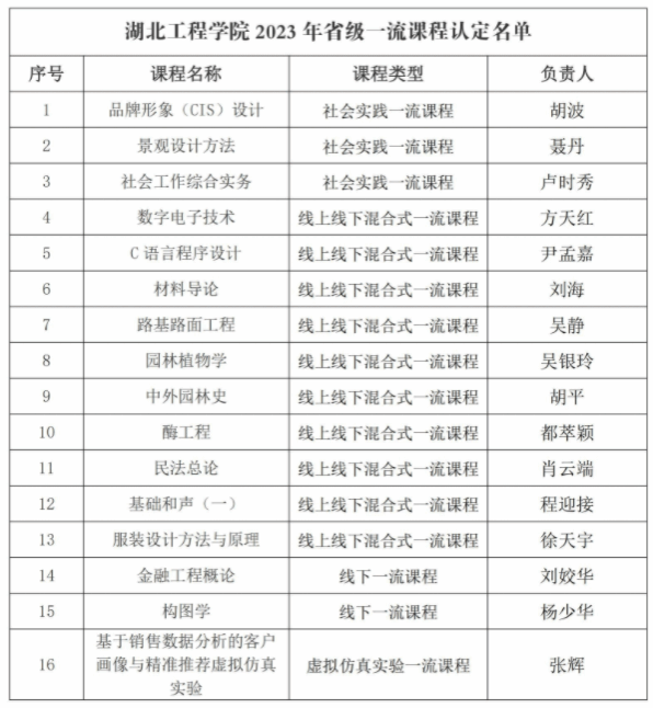 近日,省教育厅印发了《关于公布2023年度省级一流本科课程认定结果的通知》(鄂教高函〔2023〕19号),我院2门课程被认定为2023年度省级一流本科课程,其中,刘姣华博士的《金融工程概论》获批线下一流课程,张辉教授的《基于销售数据分析的客户画像与精准推荐虚拟仿真实验》获批虚拟仿真实验一流课程。截至目前,我院共获批省级一流本科课程6门。