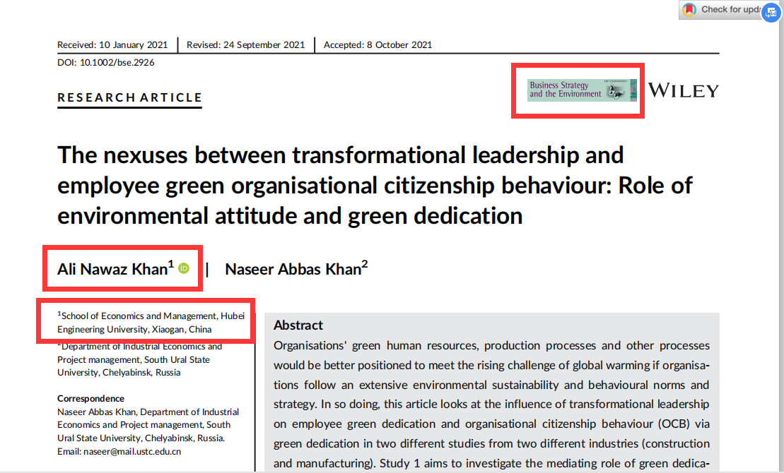 (转自williamhill英国中文新闻网)近日,我校williamhill英国教师Ali Nawaz khan博士在SSCI一区期刊Business Strategy and the Environment(《商业战略与环境》)上发表高水平研究论文The nexuses between transformational leadership and employee green organisational citizenship behaviour: Role of environmental attitude and green dedication 《变革型领导与雇员绿色组织公民行为的关系:基于环境态度和绿色奉献角色》。该期刊由Wiley出版,在商业类期刊排名第9位,2020年JCR (Clarivate Analytics)影响因子为10.302。