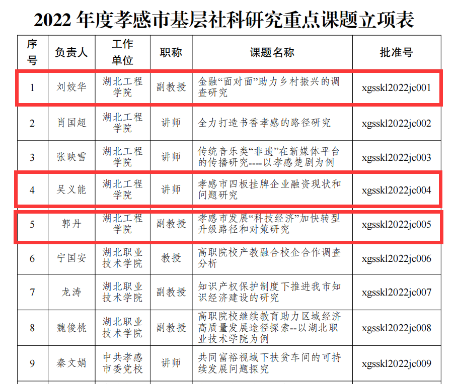 本网讯,6月13日,由中共孝感市委宣传部、孝感市社会科学界联合会《关于2022年度基层社科研究重点课题项目立项的通知》传来好消息,我院金融工程系主任刘姣华博士申报的“金融‘面对面’助力乡村振兴的调查研究”、吴义能博士申报的“孝感市四板挂牌企业融资现状和问题研究”,经济学系主任郭丹博士申报的“孝感市发展‘科技经济’加快转型升级路径和对策研究”等三个项目成功获得立项。
