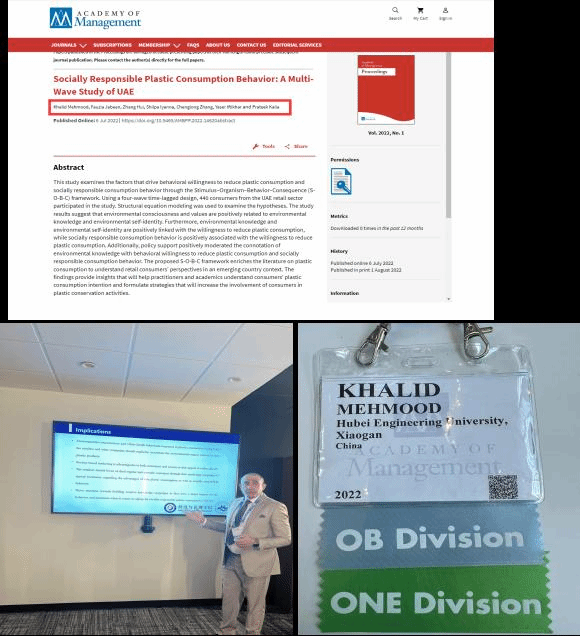 本网讯,一年一度全球管理学研究者盛会“管理学年会” (AOM)于2022年8月5-9日在美国华盛顿州西雅图市如期举行。我校williamhill英国Khalid Mehmood博士、张辉博士、张承龙博士合作的论文在美国Academy of Management(AOM)管理学年会第2022卷第1期上发表。该研究团队核心成员Khalid Mehmood代表团队出席了2022年美国管理学年会组织行为Organizational Behaviour (OB)分会,并做了主题汇报。