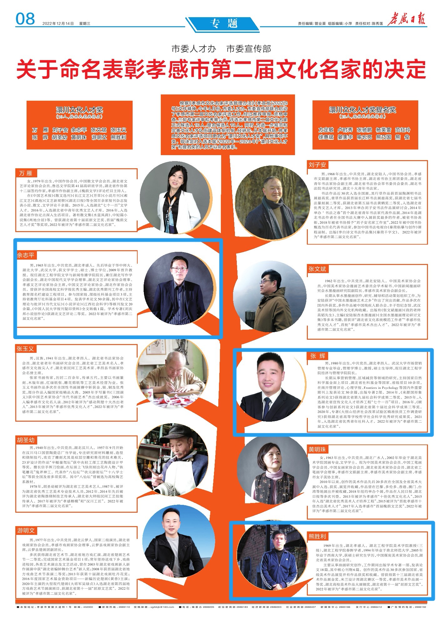 根据《孝感市文化名家评选管理办法》(孝宣发[20229号)文件精神,今年4月份,市委人才办、市委宣传部联合启动了孝感市第二届文化名家评选工作,经过推荐申报、资格审查、三轮专家评审和考察公示,我院张辉院长获评“澴川文化人才奖"”。
