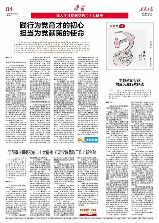 1、以“立德树人”为根本任务。人们的思想观念,决定着他们对自己行为的评判标准和自觉程度。党的二十大报告中强调“全党要把青年工作作为战略性工作来抓、广大青年要坚定不移听党话、跟党走……”,高校必须把思想政治工作放在首位,深入学习贯彻党的二十大精神,帮助青年树立远大理想,培养能吃苦、敢担当的品格,将“立德树人”根本任务真正落实到位。