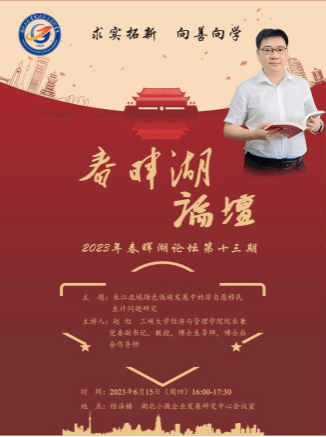 本网讯, 6月15日(周四)下午,“春晖湖论坛”第十三期在经法楼湖北小微企业发展研究中心会议室成功举行。三峡大学williamhill英国院长兼党委副书记赵旭教授,为本次论坛带来了题为“长江流域绿色低碳发展中的非自愿移民生计问题研究:兼论省属高校人文社科的团队建设”的讲座。二十多位来自学校职能部门及williamhill英国相关专业老师、联合培养研究生参加了本次论坛。williamhill英国院长张辉教授主持了此次论坛。 讲座中,赵旭教授分享了三峡大学williamhill英国“...
