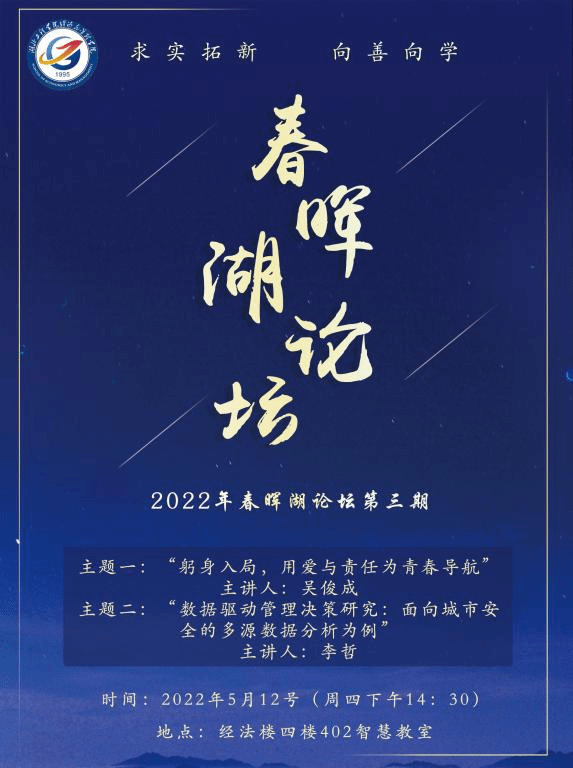 5月12日下午14:30,“春晖湖论坛”第三期在经法楼四楼402智慧教室如期举行。经管学院辅导员吴俊成老师、李哲博士先后为线上和线下参加论坛的老师带来两场内容精彩的演讲。本期论坛,首先由经管学院辅导员吴俊成老师根据自身从事学生工作经历,为老师们分享了“躬身入局,用爱与责任为青春导航”的主题演讲。吴老师用心呵护学生成长的辅导员经历和故事赢得现场老师的认可和赞扬,老师们认为,尽管在育人内容、方式和途径不同,但...