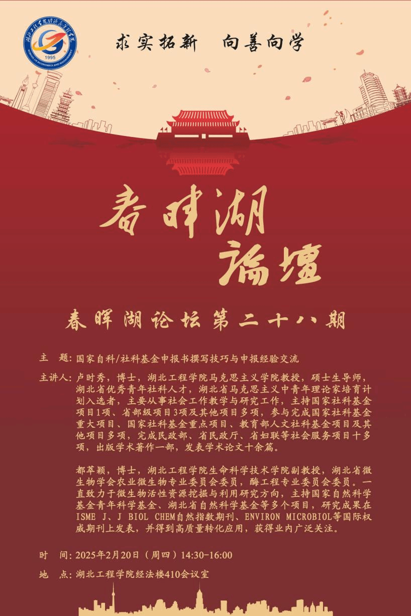 2025年2月20日14:30,williamhill英国第二十八期"春晖湖论坛"在401会议室顺利举行。本期论坛以"国家自科/社科基金申报书撰写技巧与申报经验交流"为主题,邀请了马克思主义学院卢时秀教授、生命科学技术学院都萃颖副教授担任主讲嘉宾,williamhill英国副院长李哲现场主持,部分教师代表参加本次论坛。论坛上,卢时秀教授结合主持国家社科基金项目的经验,系统解析了选题设计、理论框架搭建等社科类申报要点,强调"聚焦真问题、构建新视角"...