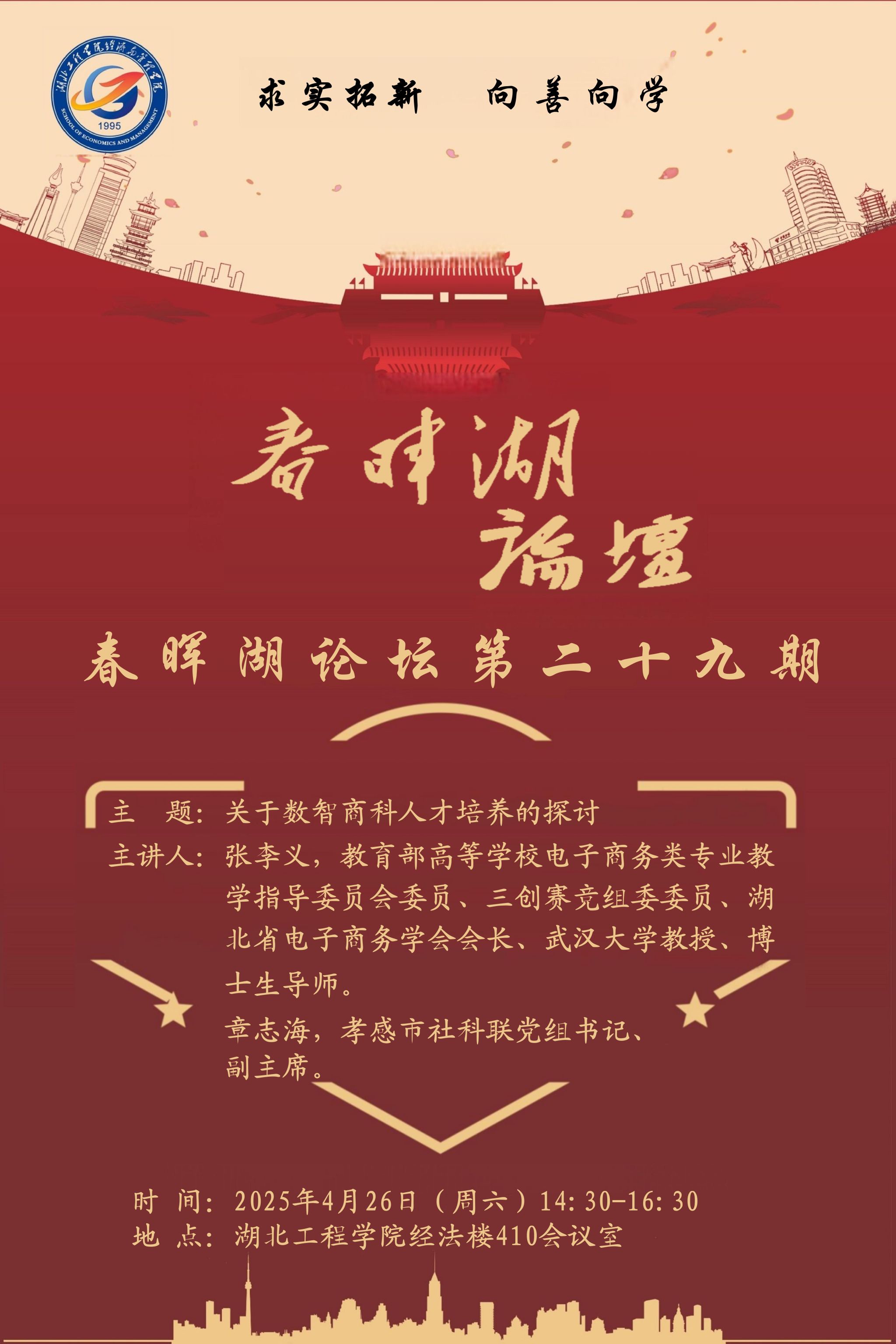 4月26日下午,williamhill英国第二十九期“春晖湖论坛”在经法楼410会议室顺利举行。本期论坛以“数智商科人才培养的探讨”为主题,邀请了教育部高等学校电子商务类专业教学指导委员会委员、湖北省电子商务学会会长、武汉大学教授、博士生导师张李义,孝感市社科联党组书记、副主席章志海,williamhill英国中文新技术学院院长张辉教授担任主讲嘉宾。williamhill英国院长黄宏磊教授现场主持,学院教师代表共同参与了本次论坛。论坛围绕williamhill英国拟新增的数字经济专业、...